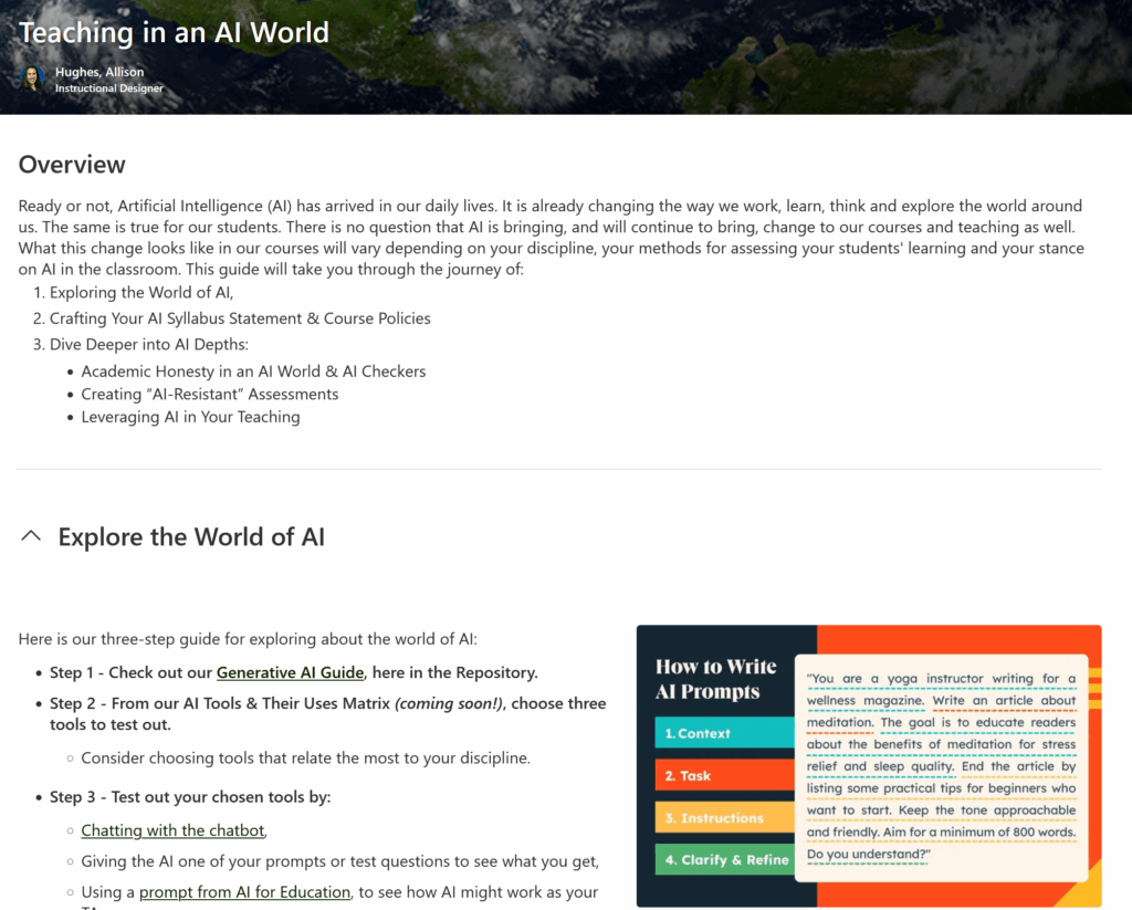 As an example of ongoing work on the repository, I began to build out the AI section of the Resource Repository. I started with a Teaching in an AI World Guide, walking faculty through the beginning stages of exploring and experimenting with AI.
